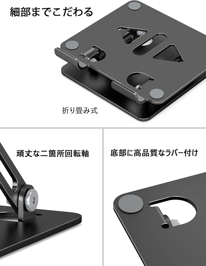 1、【安定性抜群&滑り止め&日本人の?美観より設計され】:複雑と十数回アノード酸化工芸を利用し、航空レベルのアルミ製品です。その故、性能は他社製品より強いです。接触面は六個のゴムがあり、タブレットを保護する事ができます。底部または四つのゴムが付け、接触した卓等を保護されます。なお、日本の市場に向かて、中空部分は人間の顔との形で透かし彫りします。