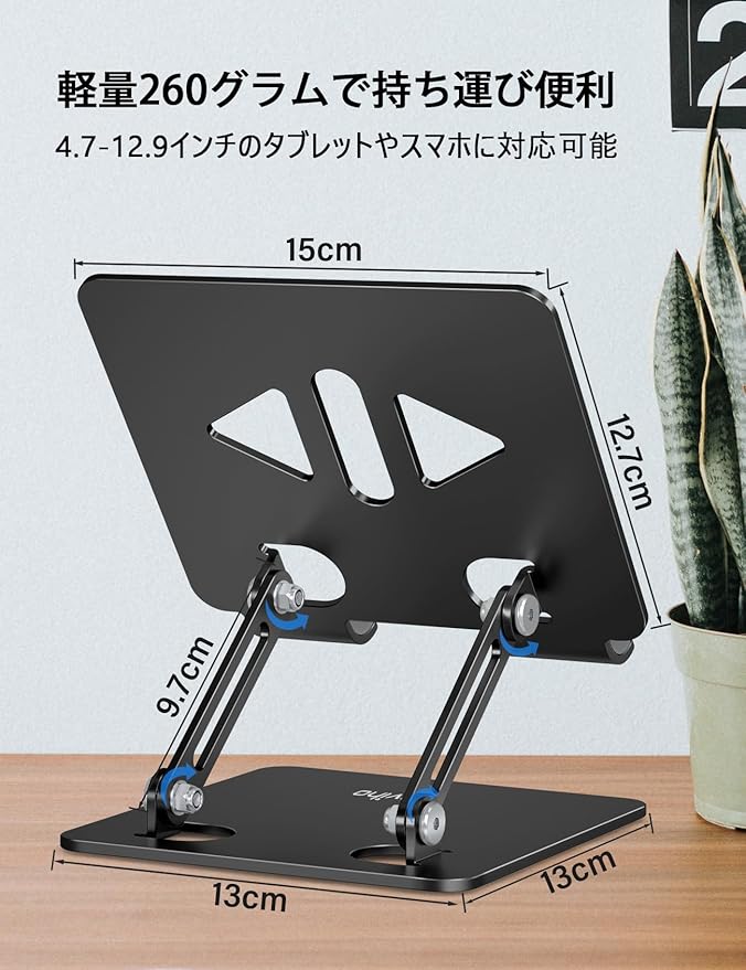 Aoviho(アオビホ) タブレットスタンド ipadスタンド 折り畳み式 tablet stand 描きホルダー アイパッド アルミ製 持ち運び便利 高さ角度調整可能 卓上 液タブ 充電台 スマホ立て 縦置き 横置き テレワーク ネットワーク会議 ipad air/pro/mini/Kindle/switchなど4-12.9インチに対応 (黒 ブラック)