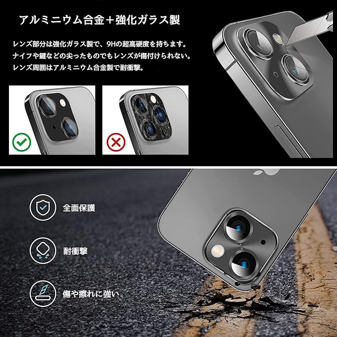 【耐衝撃性 キズ防止】巨大化になったカメラ、衝撃や接触からの破損のリスクも上がり、カメラ保護はもはや必須カメラカバーはiphoneと同じガラス、また航空機用アルミ合金を採用、耐衝撃性が普通製品より20倍高く、盛り上がったレンズを角や落下への衝撃からしっかりと保護。更に、表面にレ一ザ焼入れ技術を採用、優れた硬化層を形成、ダイヤモンドに匹敵する硬度を実現、鍵などの鋭利な物による擦り傷から守れる。