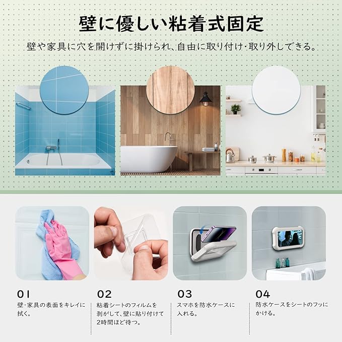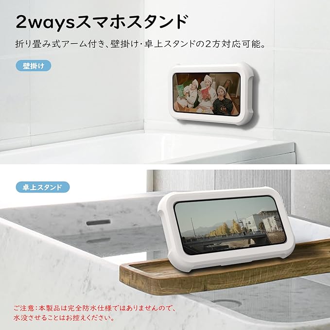「2waysスマホスタンド」 伸縮式のスタンド設計で、スタンドを引っ張り出せば普通の卓上スマホスタンドのように卓上に自立できます。付属の粘着シールを壁に貼り付けば、ケースの背面フックで壁に掛けられ、使い勝手がいいです。ご注意:本製品は完全防水仕様ではありませんので、恣意的に水をかけたり、水中での使用をお控えください。不適切な使用方法により生じたあらゆる損害につき、一切の責任を負いかねますので予めご了承ください。