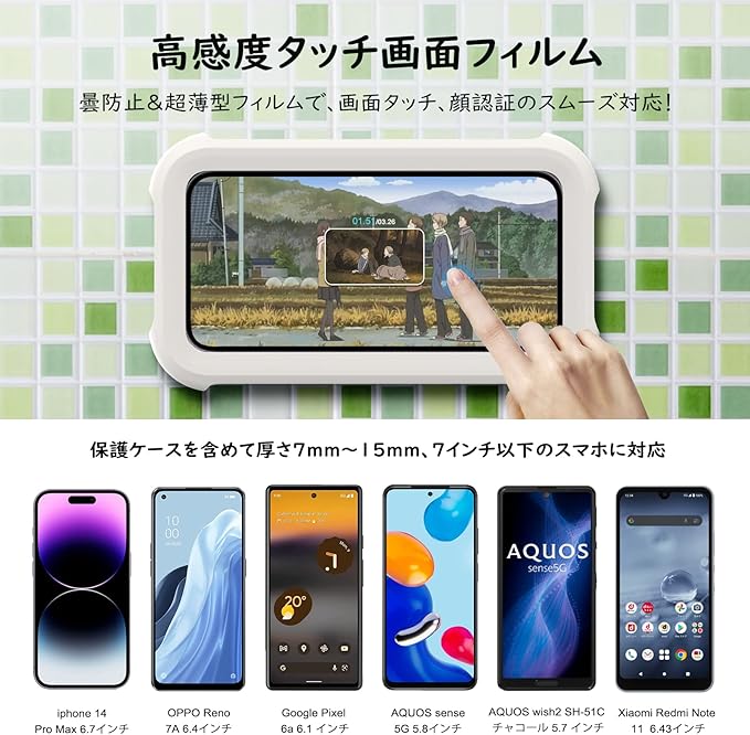 スマホ 防水ケース お風呂 TiMOVO iphone 耐水ケース お風呂 壁掛け スタンド 7インチ以下スマホ対応 スマホホルダー 360 回転 角度調整可能 自立可能 卓上 貼り付けシール3枚付き 顔認証 高感度タッチ 伸縮式スタンド 強力粘着 防塵 携帯 浴室 キッチン 洗面所 ラック トイレ 白
