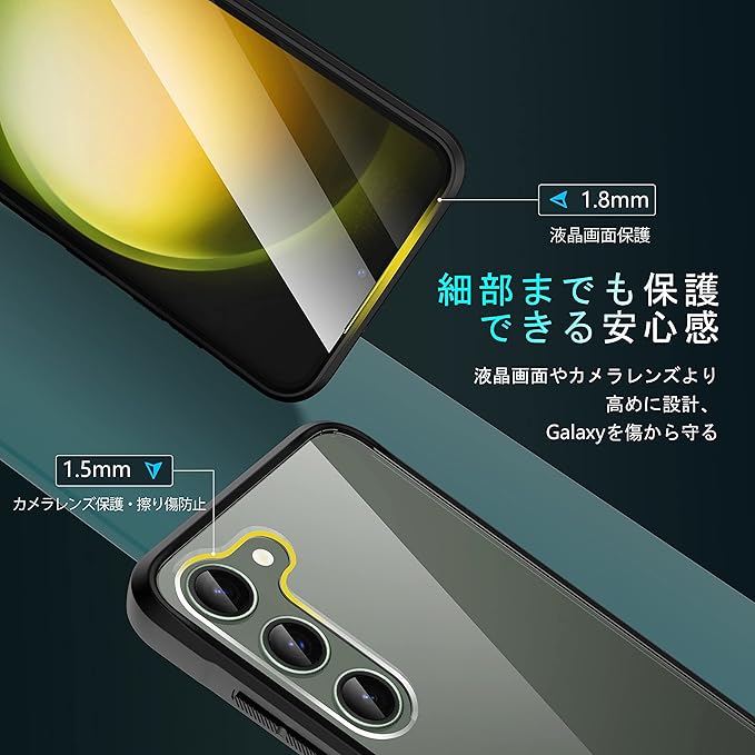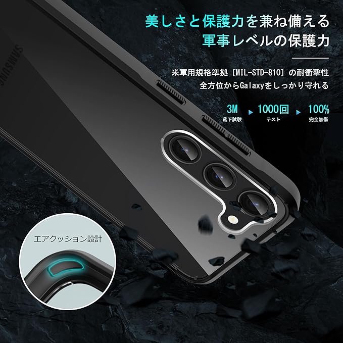 【水晶のような透明感と超高耐衝撃性】透き通って高い透明度を誇り、背面がGalaxy S23のカラーや質感をそのまま映え、高級感が溢れて、すごくかっこよくてこのクリア感にいつまでも見惚れてしまいます。米国国防総省の耐衝撃試験「MIL-STD-810G」に認証済み、耐衝撃性能は20倍アップ。ギャラクシーS23を全方向からしっかりと保護できす。