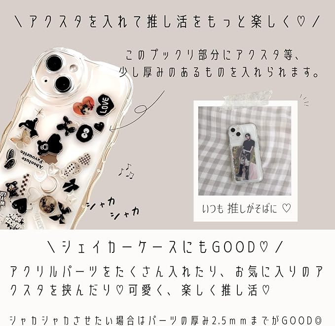 製品について:本製品の特性上、背面部分に空洞がありますので、少し厚みのあるようなアクリルスタンドが挟めます流行りのシェイカーケースにも 推し活が楽しめますまた、機種により、カメラ部分の形状(出っ張りの有無)は異なっておりますので、ケース形状が画像・動画と異なる場合がございます。