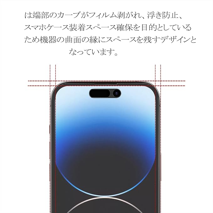 『 対応機種 』iPhone14 Pro (縦143.74mm / 横67.73mm) に適応しています。携帯は端部のカーブがフィルム剥がれ、浮きの防止、スマホケース装着スペース確保のため、機器の曲面の縁にスペースを残すデザインとなっています。