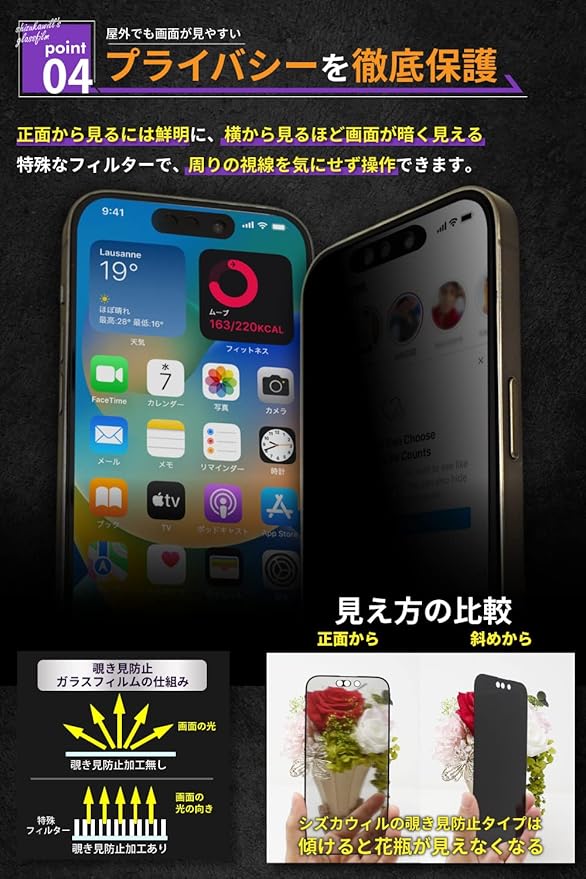 【横からの覗き見をシャットダウン】 通勤時の電車の中など他人から覗き見されないように保護フィルター特殊加工をしており、横からの気になる覗き見を防ぐ[覗き見防止]強化ガラスフィルムです。