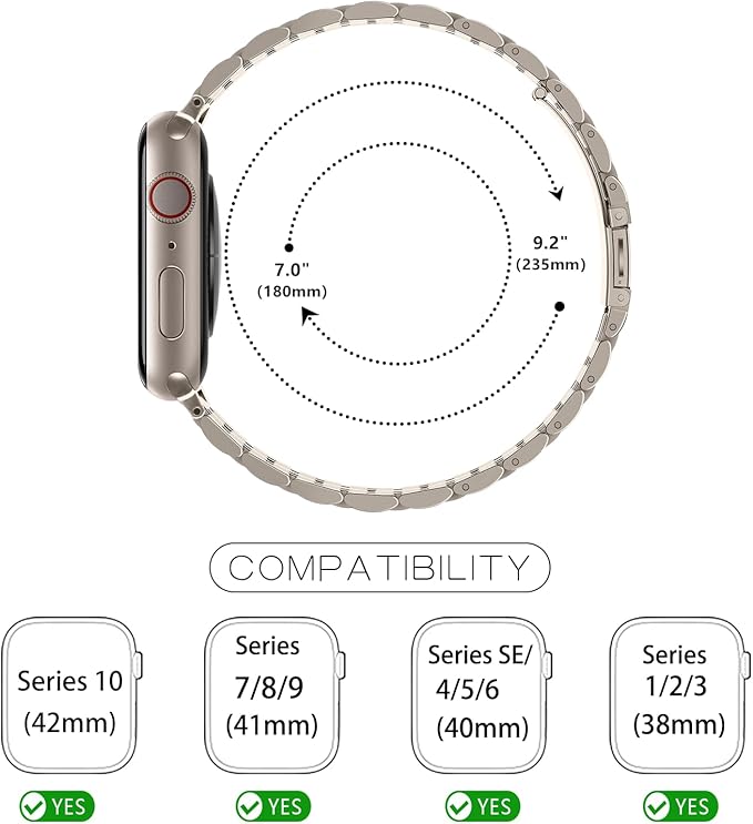 【メタルバンド コンパチブル Apple Watchバンド38mm/40mm/41mm/42mm(シリーズ10)】対応機種: Apple Watch シリーズ 10 (42mm),シリーズ 9/8/7 (41mm)、SE2/SE /シリーズ6/5/4 (40mm)、シリーズ3/2/1 (38mm)。