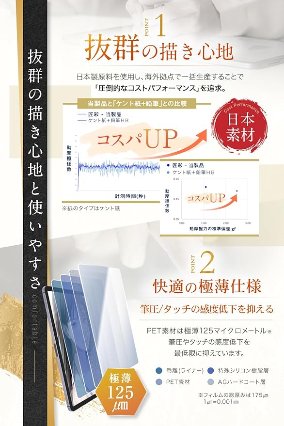 【快適の 極薄仕様 】 フィルム のPET部は厚み0.125マイクロメートルの極薄仕様。 筆圧やタッチの感度低下を最低限に抑え、 Apple Pencil ペン先 第1世代 第2世代 の使用にも対応