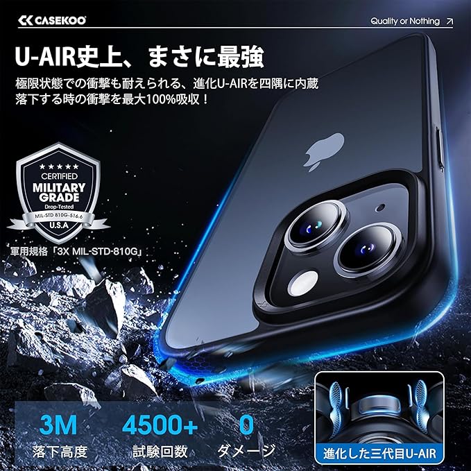 【米軍MIL規格・指紋防止】CASEKOO iPhone 15 用 ケース 耐衝撃 滑り止め 指紋防止 米軍MIL規格 マット仕上げ ストラップホール付き 黄変防止 耐久性 カバー ワイヤレス充電対応 アイフォン 15 用 6.1 インチ ケース(マットブラック)