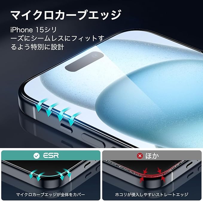 ESR for iPhone 15 Plus保護フィルムセット強化ガラス保護フィルム 3 枚 独立型レンズフィルム 2セット 2.5Dカーブエッジ フルカバー 米軍MIL規格の保護 傷に強い