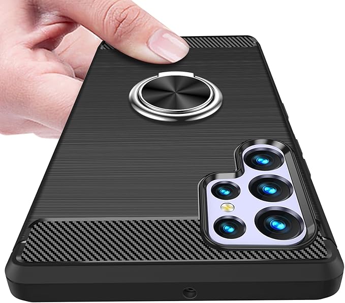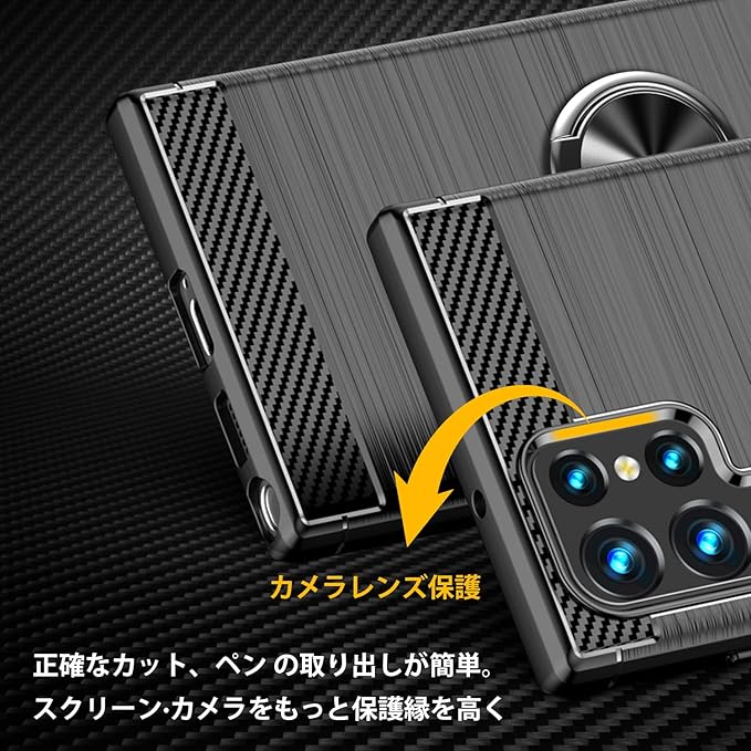 Galaxy S23 Ultra ケース リング付き TPU 炭素繊維スマホケース 衝撃吸収 スタンド機能 薄型 360回転 車載ホルダー対応 散熱加工 指紋防止 シリコン スリム ソフト サムスン ギャラクシーs23 ウルトラ 携帯カバー 黒 KC-14-15