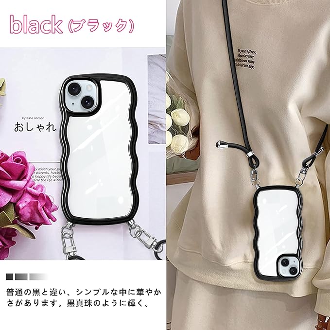 iPhone15 ケース クリア ショルダー カバー いPhone 15 スマホケース 創意 個性 肩掛け 首掛け 斜めかけケース 可愛い かわいい 韓国 透明 TPU 薄型 耐衝撃 アイフォン15(ブラック)