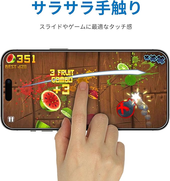 【サラサラ手触り】このアンチグレアガラスの表面を顕微鏡で見ると、スクラブ保護フィルムはボコボコと凹凸が見えます。この凹凸は人間の指では段差として感じることはなく、触れる面積が減るため一般的な強化ガラスと比べるとサラサラとした使用感になるのです。表面が「サラサラ」としているので、快適にゲームやフリック操作することが可能です。
