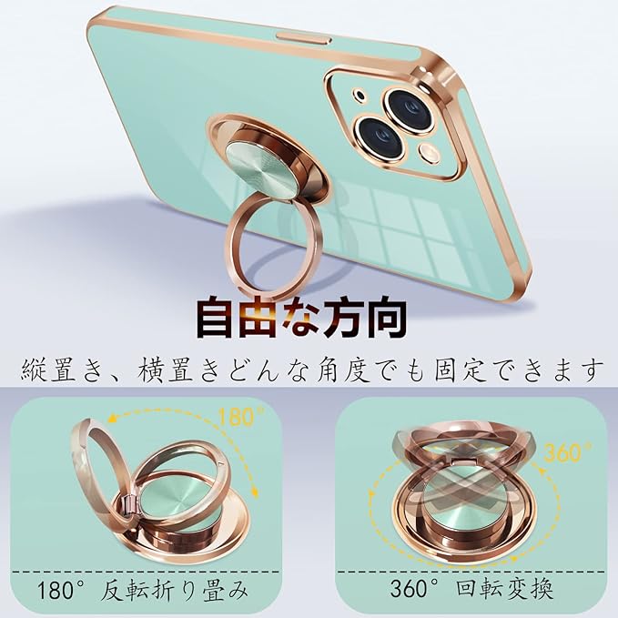 iPhone14 Plus ケース リング付き アイフォン14Plus リング カバー 耐衝撃 TPU 360 回転 スタンド機能 メッキ加工 車載ホルダー ストラップホール付き 6.7インチ(ライトシアン)