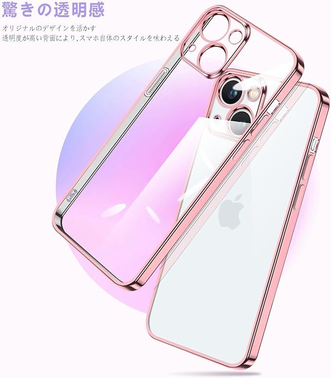 【背面クリア・メッキ枠】背面は透き通った高い透明度を誇り、フレームは3層メッキ加工技術と超微細なレーザー加工技術によって設計。オシャレで独特の輝きを放ち、シンプルで高級感溢れています。iPhone15の美しさを引き出しつつ、ピンクゴールドエッジで魅力的なアイホンを演出します。