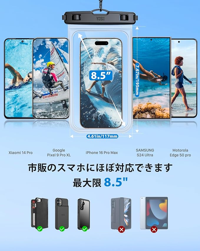 【8.5インチ大きめ・ケースのまま入れる】YOSH スマホ防水ケース 大きめ 海 プール 防水強化バージョン タッチ操作 顔認証 IPX8認定 お風呂用 水中 撮影 海釣り シュノーケリング釣り 雨 潜水 水泳 雪 温泉適用 透明 8.5インチ対応 iPhone16ProMax/Galaxy S24 Ultra/HUAWEI Mate 60 Pro/AQUOS R9/ARROWS対応 2枚セット