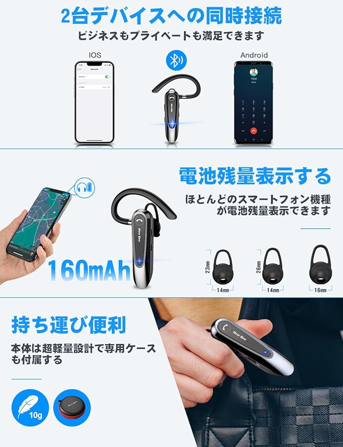 【24時間連続使用】New Bee B45マイク付き耳掛け式Bluetoothヘッドセットは240mAh充電式バッテリーが内蔵され、フル充電(約2H)で通話約20時間、音楽再生約24時間使えます。B45 ワイヤレス ヘッドセットはただ30分急速充電で10時間連続通話できます。通勤、運転、テレワークなどの長時間使用するの場合には B45 ハンズフリー bluetoothイヤホンが最適。専用ケース付き、コンパクトで携帯しやすい。このダブルマイク付き片耳イヤホンは日本語音声ガイダンスが付きのためより良い使いやすいです。