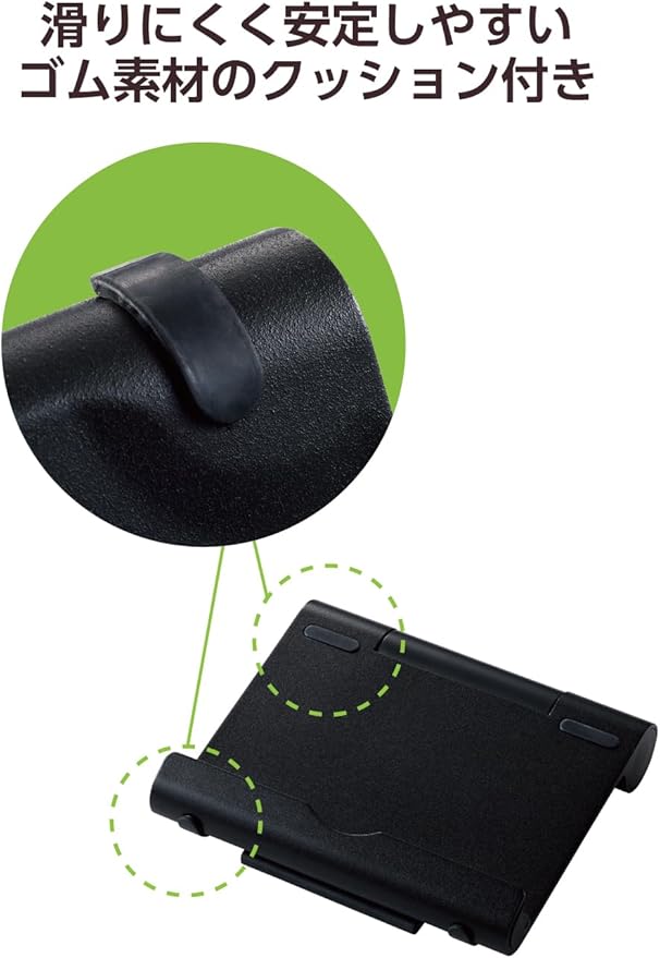 スタンドとホルダーの底面、ホルダーの端末が接触する部分にゴム素材のクッションが付いています。滑りにくく安定して使用でき、テーブルなどの家具や端末への傷を防ぎます。