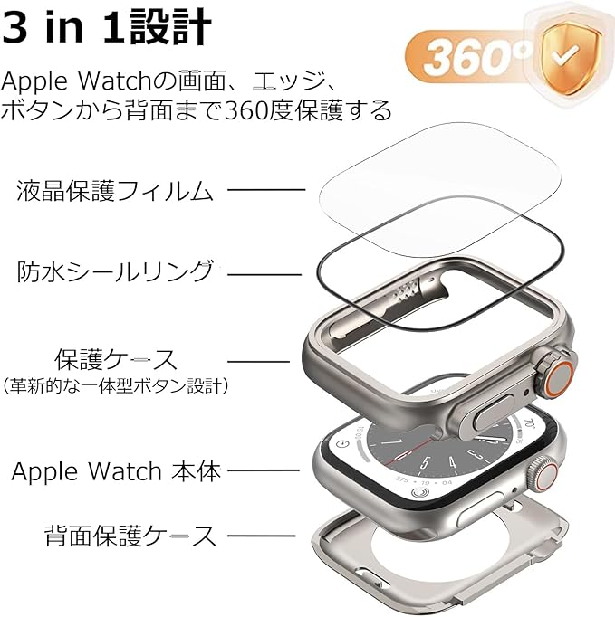 「液晶保護フィルム+保護ケース+背面保護ケースの3 in 1設計」本製品は、Apple Watchの画面、