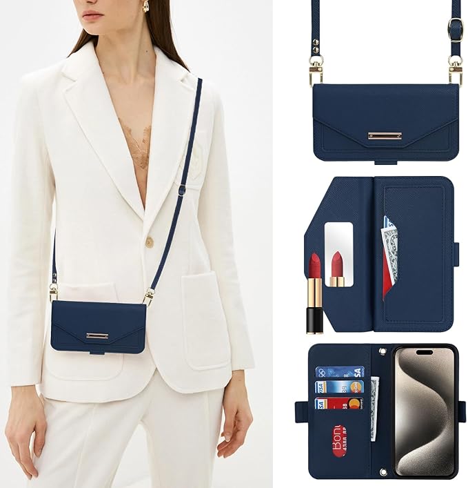 【Hamany】 対応 iphone 15 pro max ケース ショルダー 鏡 アイフォン15プロマックス ケース 手帳型 ストラップ付き ミラー カード収納 財布 スマホケース iphone 15 pro max クロスボディケース 肩がけ 首掛け 斜め掛け 耐衝撃 レザー カバー -青