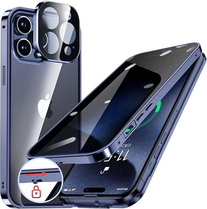 HGUTREY【覗き見防止・自動ポップアップボタン】 iPhone15 Pro 用 ケース 【ロック付き】【ストラップホール付き】一体型レンズ保護 両面9H強化ガラス iPhone15プロケース 耐衝撃 アルミ バンパー メタルフレーム スマホケース 薄型 背面クリア 高感度タッチ 軽量 すり傷防止 ワイヤレス充電対応 アイフォン15 Pro 用 カバー 6.1インチ(ディープブルー)