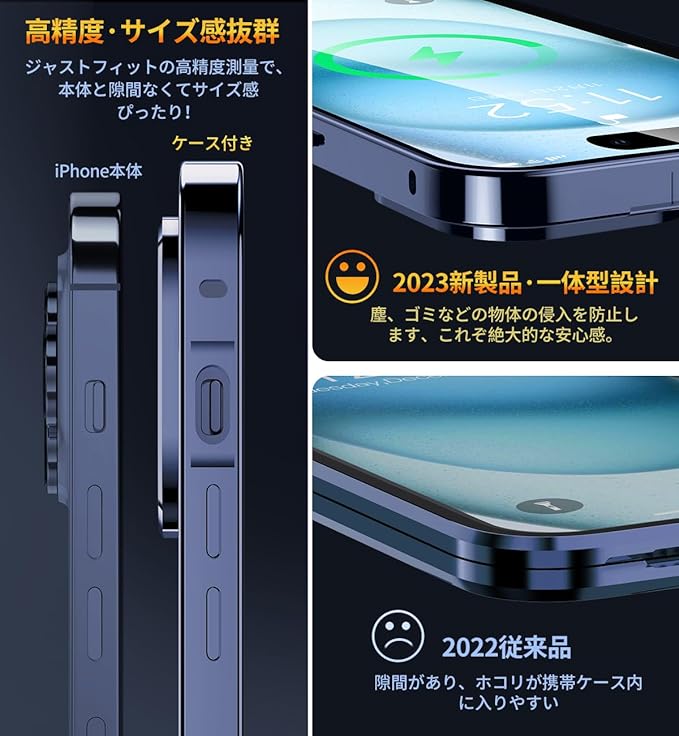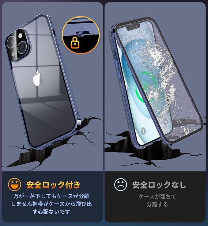 NIANGUO【ロック機能付き・自動ポップアップボタン】 iPhone15 用 ケース クリア 【両面強化ガラス】 9H硬度 【一体型レンズ保護】 アイフォン15 カバー アルミバンパー メタルフレーム 耐衝撃 傷防止 高感度タッチ 薄型 軽量 ワイヤレス充電対応 ストラップホール付き あいふぉん15 用 ケース 6.1インチ(ディープブルー)