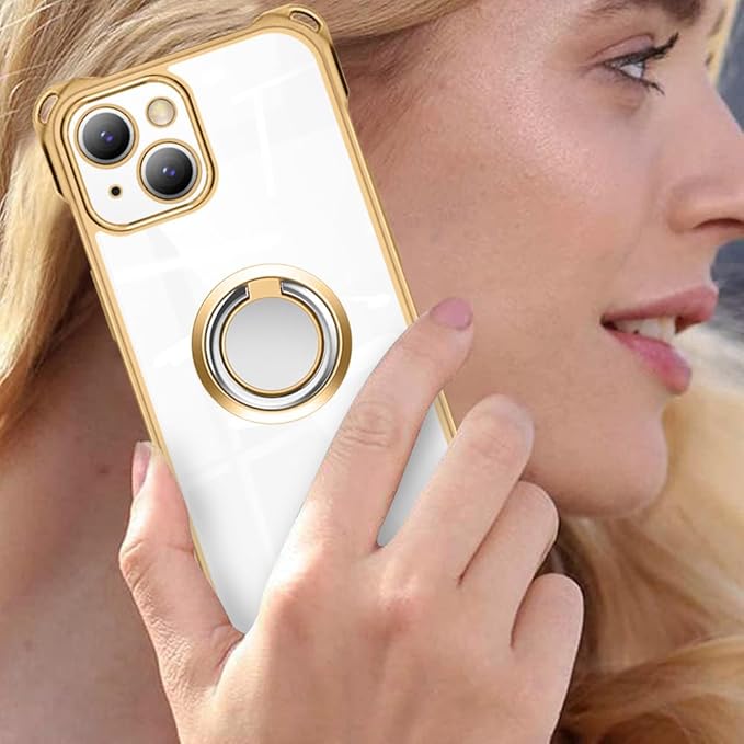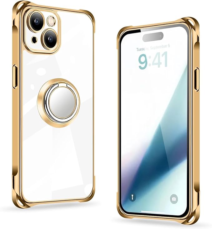 iPhone 15 用 ケース クリア リング付き スタンド機能 iPhone15 用 カバー 耐衝撃 全面保護 軽量 薄型 おしゃれ スマホケース ソフトケース アイホン 15 用 携帯ケース メッキ加工 (ゴールド)