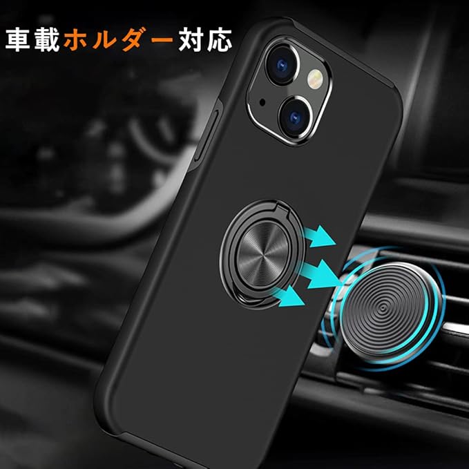 iPhone 15 用 ケース リング付き 耐衝撃 TPU 二重構造 アイフォン15 カバー リング Uovon スマホケース あいほん15 リングつき スタンド機能 車載ホルダー対応 擦り傷防止 落下防止 おしゃれ ブラック