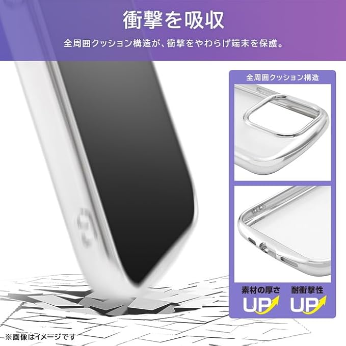 盛って守る メタリックフレーム メタリック加工 / 衝撃をやわらげる全周囲クッション構造 / 衝撃吸収 端末保護 衝撃に強い 衝撃を吸収 / 耐衝撃 耐衝撃ケース / エアクッション クッション性抜群 / ソフトケース ソフト やわらか素材 / フィットするグリップ感 グリップ 向上 / 落下防止 落としにくい 手になじむ 持ちやすい 端末を守る