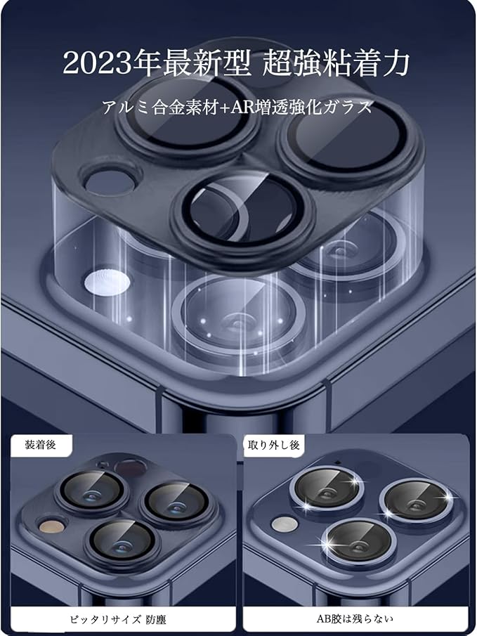 【対応機種・アルミ合金一体感】:Apapeyaカメラ保護カバー iPhone 15 Pro/iPhone 15 Pro Maxに対応するカメラフィルム1枚(ブルー)。15pro/15promax機種と同じ色で本体のレンズ部分と完全に融合していく、一体感と高級感が溢れています。衝撃に強いアルミ合金製+日本製9H強化ガラスの組み合わせ全面保護タイプで最高な保護力を提供しています。擦り傷や衝撃からカメラレンズをしっかりと守られます。