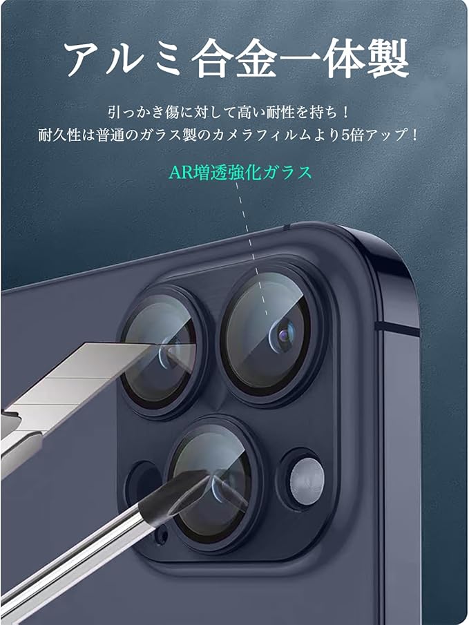 【保護性高い】:カメラフィルムはスマホのレンズ部分の全体覆われている,三つレンズの真ん中にAR超高透過率ガラスを採用され、レンズフィルムの周りにアルミニウム材質で擦り傷や衝撃からカメラレンズをしっかりと守られます。アルミ合金製なので 耐久性は普通のガラス製のカメラフィルムより5倍UP