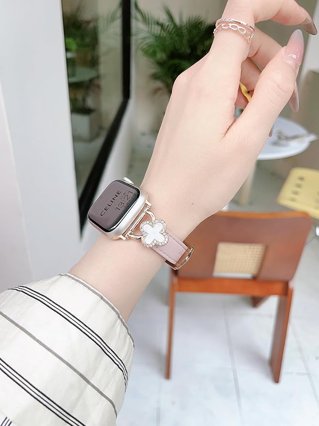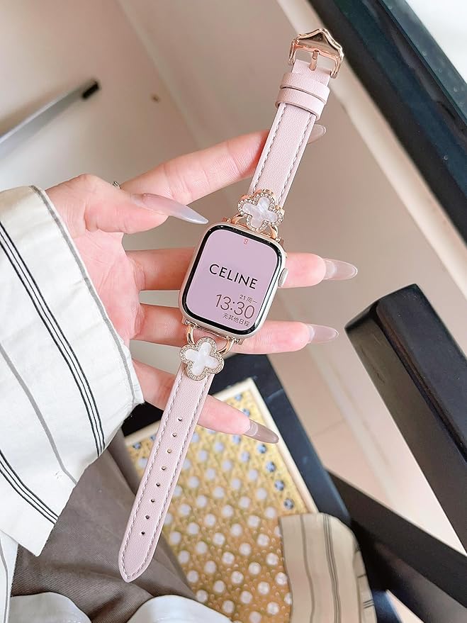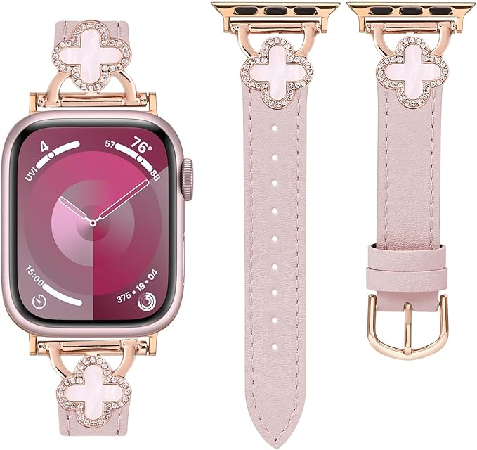 コンパチブル Apple Watch バンド 本革 レディース アップルウォッチ Ultra2/Ultra/Series10/9/8/7/6/5/4/3/2/1/SE レザー交換ベルト 四つ葉のクローバー キラキラ 可愛い アップルウォッチ バンド 女性向け iWatch 38mm 40mm 41mm 42mm 44mm 45mm 49mmに対応 ( ピンク,38/40/41/42mm(Series10の42mm)