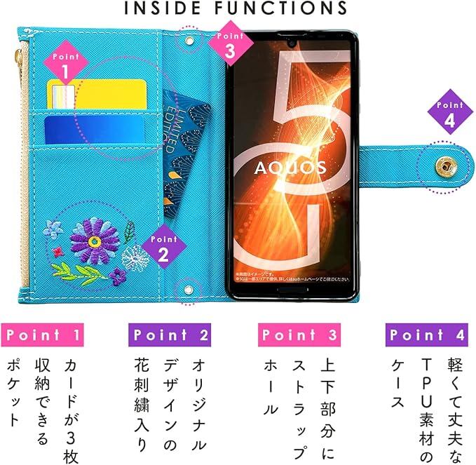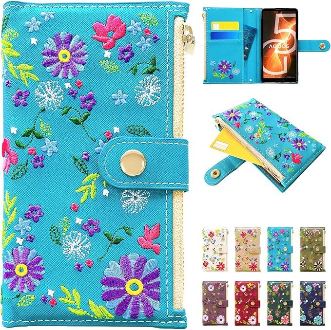 Xperia 5 V SO-53D SOG12 XQ-DE44 用 ケース 手帳型 カバー 手帳型ケース SO53D SO-53Dケース SO-53Dカバー SOG12ケース SOG12カバー XQ-DE44ケース XQ-DE44カバー おしゃれ花刺繍 ターコイズ