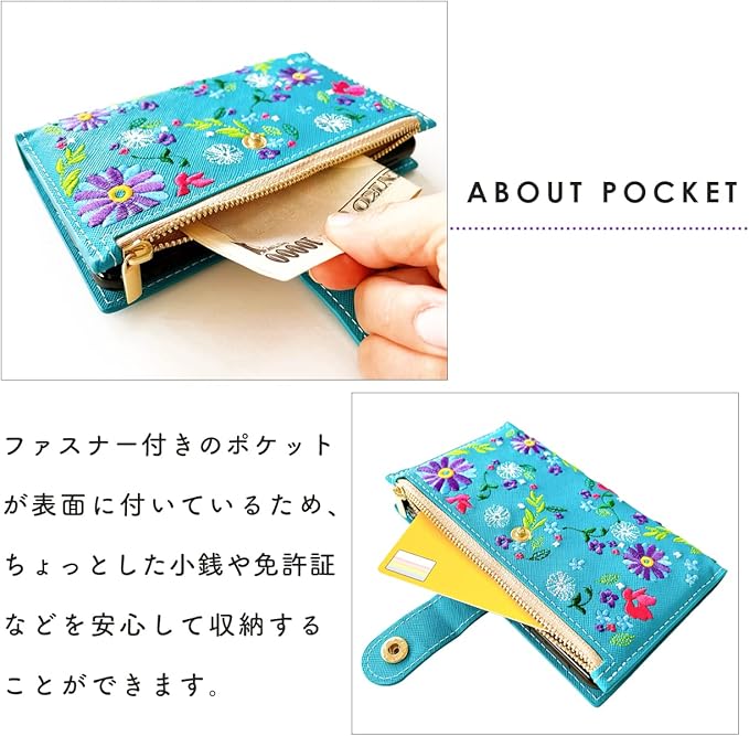 Xperia 5 V SO-53D SOG12 XQ-DE44 専用 手帳型ケース。小銭や免許証等の収納に便利なファスナー付きの手帳型ケースです。上品なサフィアーノ生地に、色鮮やかな花柄の刺繍を施しています。
