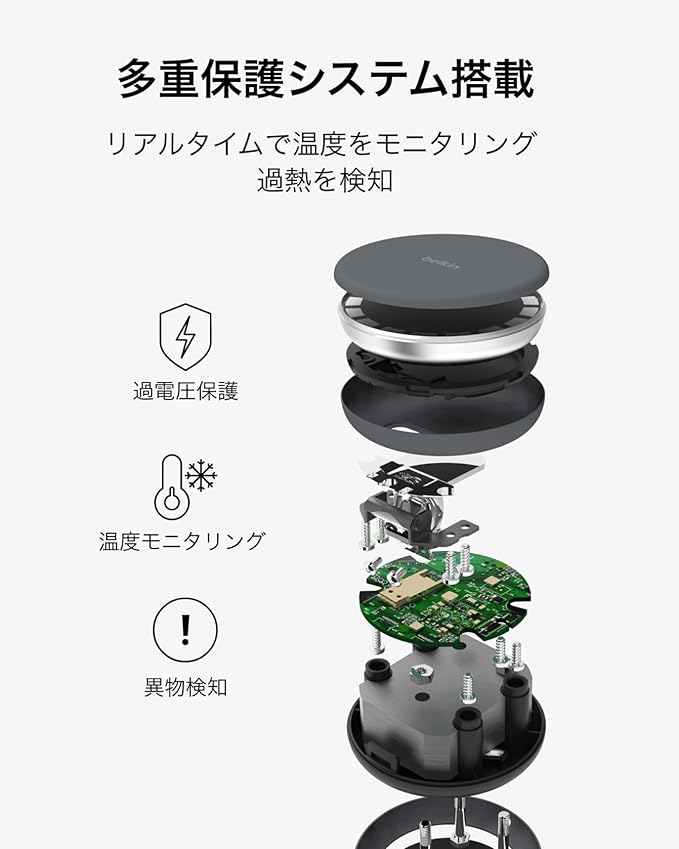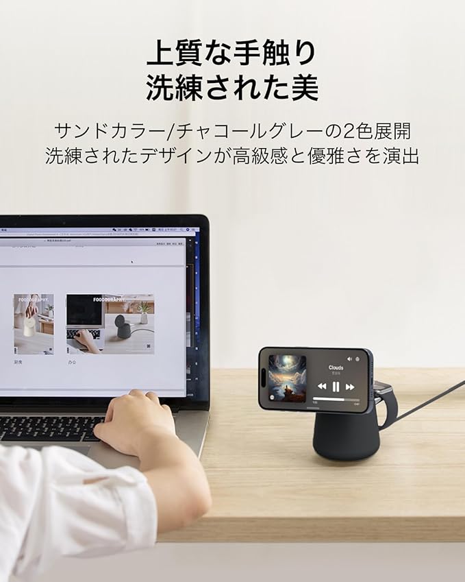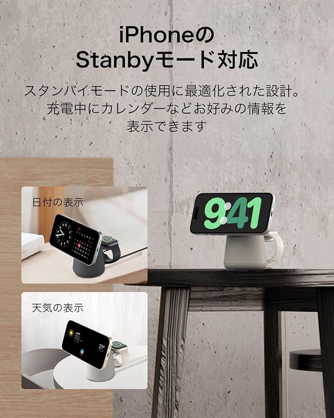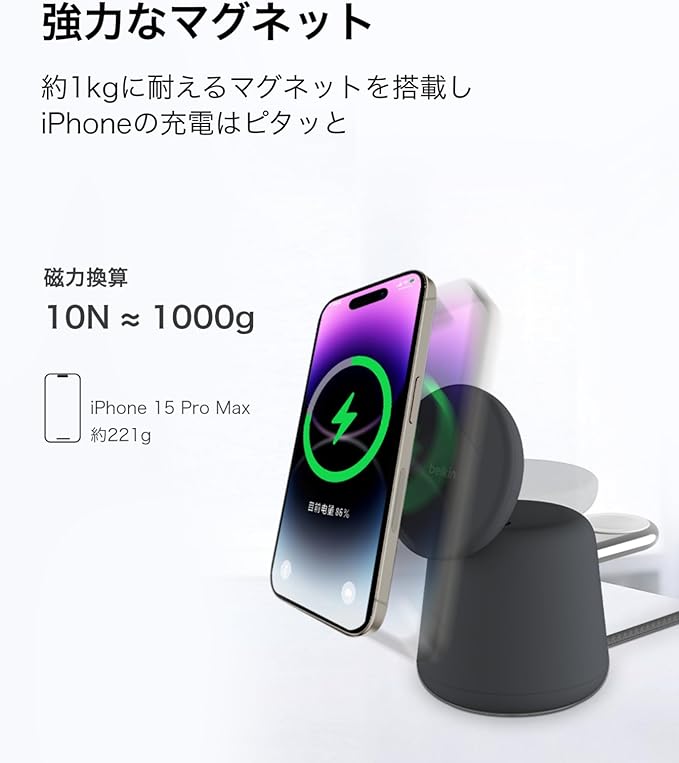 【iPhoneのスタンバイモードに最適】BelkinのMagsafe対応ワイヤレス充電器WIZ020は、iPhoneのスタンバイモードに合わせて設計されました。充電台は0〜70度の範囲で角度を調整でき、ベッドサイドやデスクどんな場所で充電していても画面を確認できます。充電台滑り止め付きでマグネットでしっかりとiPhoneを吸着、お好みでiPhoneを横向きにして配置することも。