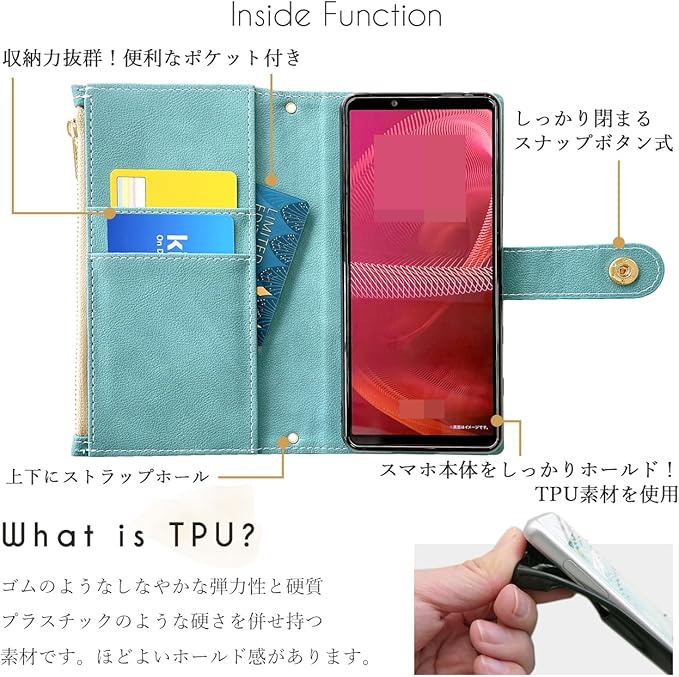 スタンド式、ワイヤレス充電には対応しておりません。手帳部分とケース部分は接着しておりますが、強くめくると剥がれる場合がございます。