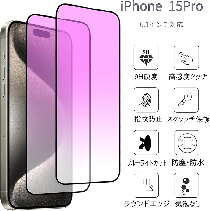 iPhone 15 Pro 強化ガラスフィルム 6.1インチ ブルーライトカット 全面保護フィルム 硬度9H 滑らかなタッチ操作 指紋付着防止 気泡防止 ガイド枠付き 貼り付けは簡単 【強化ガラスフィルム(2枚
