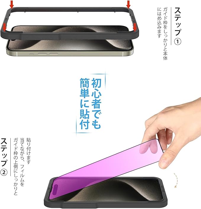 【対応機種】iPhone 15 Pro(アイフォン 15プロ)用。初めての方でも簡単に貼り付けられるよう、専用のガイド枠付き。機種の選択には間違いがないよう、ご注文前によくお確かめください。