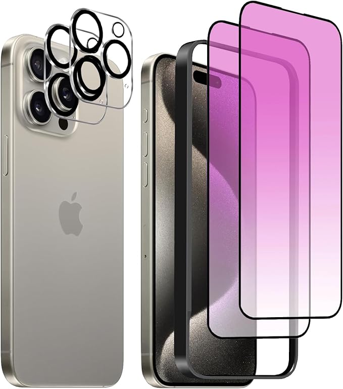 iPhone 15 Pro 強化ガラスフィルム 6.1インチ ブルーライトカット 全面保護フィルム 硬度9H 滑らかなタッチ操作 指紋付着防止 気泡防止 ガイド枠付き 貼り付けは簡単 【強化ガラスフィルム(2枚入り)+レンズ保護フィルム (2枚入り)】