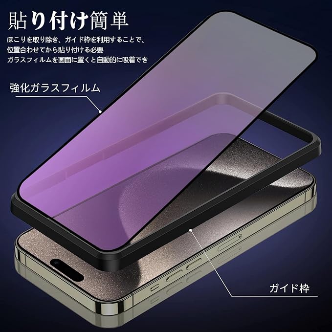 DXFAU【2枚入り】ブルーライトカット iPhone 15 Pro 強化ガラスフィルム 液晶画面 6.1インチ 気泡防止 指紋付着防止 滑らかなタッチ操作 ガイド枠付き 貼り付けは簡単