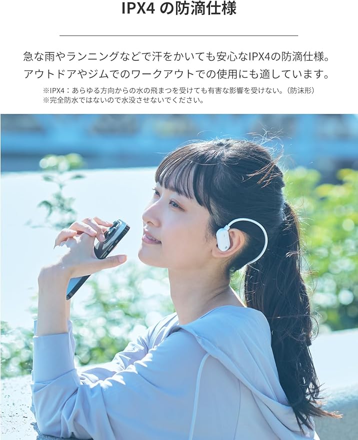 【浮遊するドライバーユニットで安定した高音質再生を実現フローティングフィットシステム】ネックバンドの張力によるソフトな圧力に加え、リング形状のシリコン製イヤーピースで筐体の装着位置を浮遊した状態で安定させる独自構造「フローティングフィットシステム」を採用。フローティングフィットシステムは、筐体から伸びるリング形状のイヤーピースが耳甲介にぴったりと収まり、耳の大きさや形状に関係なく、耳から浮遊したドライバーユニットを内蔵する筐体を理想的な位置に保持します。耳が受け取る音の方向を安定させることで、ランニングやエクササイズ時でも筐体位置のずれや音質の変化によるストレスを感じることがなく、オープンイヤー型イヤホンとは思えないほど臨場感あふれる高音質再生を実現しました。まるで耳元でスピーカーが鳴っているかのような、開放的なリスニング空間をい