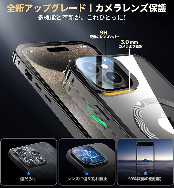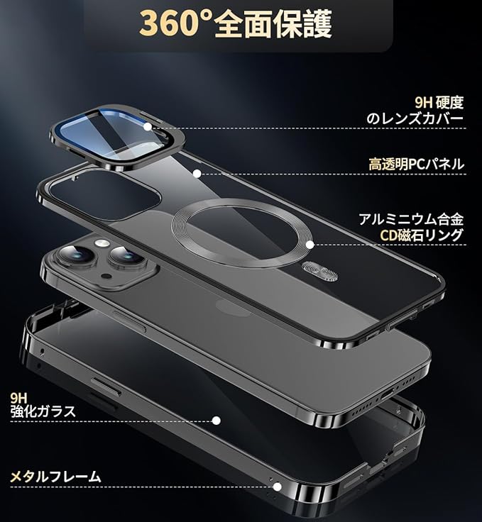 【カメラレンズ保護・スタンド一体】NIANGUO iPhone15 用 ケース MagSafe対応 クリア 両面 【ロック付き・アクションボタン】 隠しカメラスタンド アイホン15ケース 9H強化ガラス メタルフレーム ストラップホール付き 画面感度良い ワイヤレス充電対応 あいふぉん15 用 ケース 6.1インチ(ブラック)