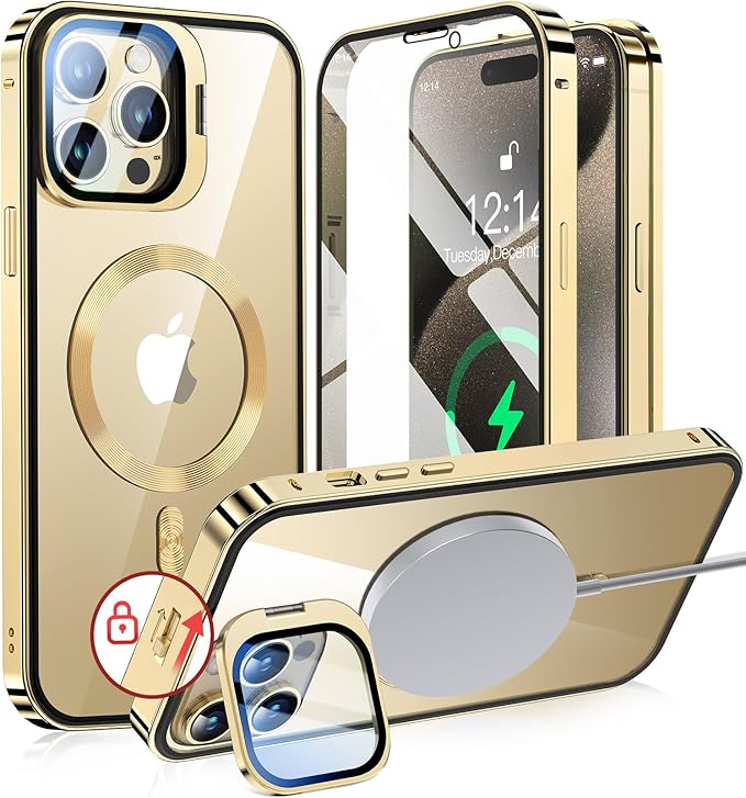 【カメラレンズ保護・スタンド一体】NIANGUO iPhone15 Pro 用 ケース MagSafe対応 クリア 両面 【ロック付き・アクションボタン】 隠しカメラスタンド アイホン15プロケース 9H強化ガラス メタルフレーム ストラップホール付き 画面感度良い ワイヤレス充電対応 アイフォン15 Pro 用 ケース 6.1インチ(ゴールド)