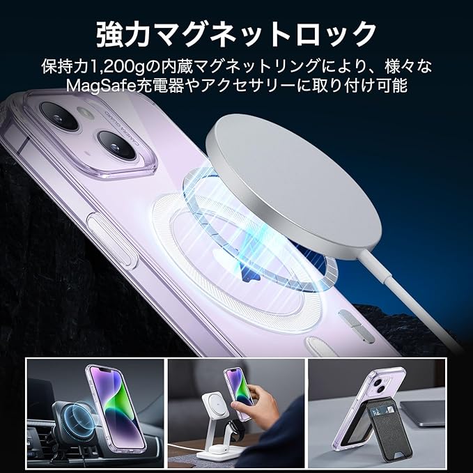 【より強力な磁気ロック】1,200gの保持力を持つ強力な内蔵マグネットが、より速く、より便利な瞬間ワイヤレス充電、およびMagSafeアクセサリーによる安全な磁気固定を可能にします。