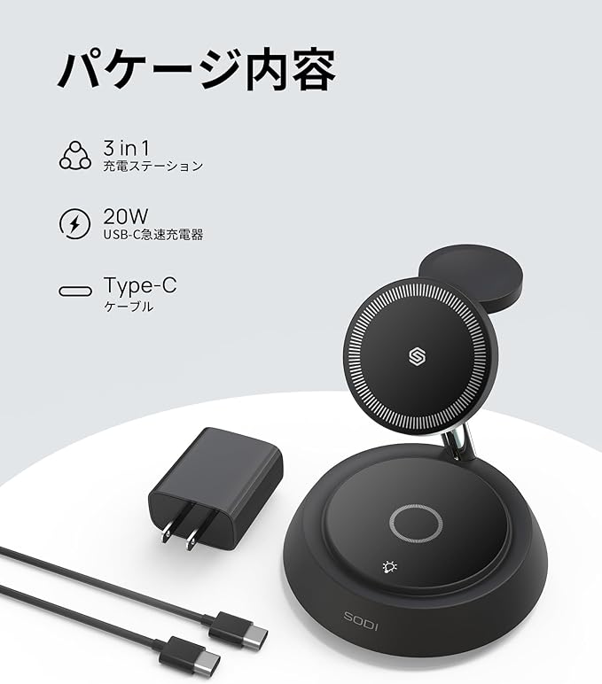 SODI ワイヤレス充電器 3in1 マグセーフ 充電器 急速充電15W/10W/7.5W 磁気充電器 マグネット式 夜間ライト 充電スタンド iPhone16/15/14/13/12/Apple Watch/AirPodsシリーズ 20Wアダプター付属 ベッドサイド ブラック