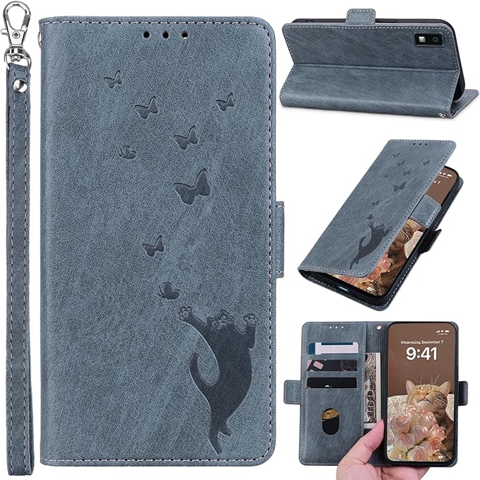 AQUOS wish3 ケース 手帳型 スマホケース アクオス wish 3 スマホケース aquos wish3 スマホ aquos wish3 ケース アクオスwish3ケース 手帳型 AQUOS sh53d ケース 手帳型 人気 蝶と猫の3Dパターン スタンド キャッシュポーチ リストストラップ プレミアム耐久性PUレザー 強い磁気吸引 リストストラップ [メタリックグレー]