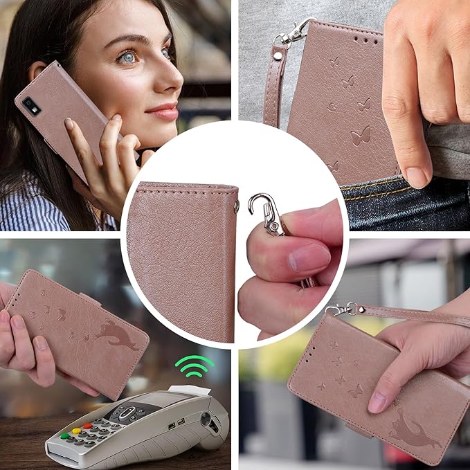 AQUOS wish3 ケース 手帳型 スマホケース アクオス wish 3 スマホケース aquos wish3 スマホ aquos wish3 ケース アクオスwish3ケース 手帳型 AQUOS sh53d ケース 手帳型 人気 蝶と猫の3Dパターン スタンド キャッシュポーチ リストストラップ プレミアム耐久性PUレザー 強い磁気吸引 リストストラップ [ローズゴールド]