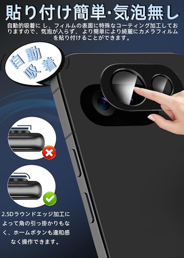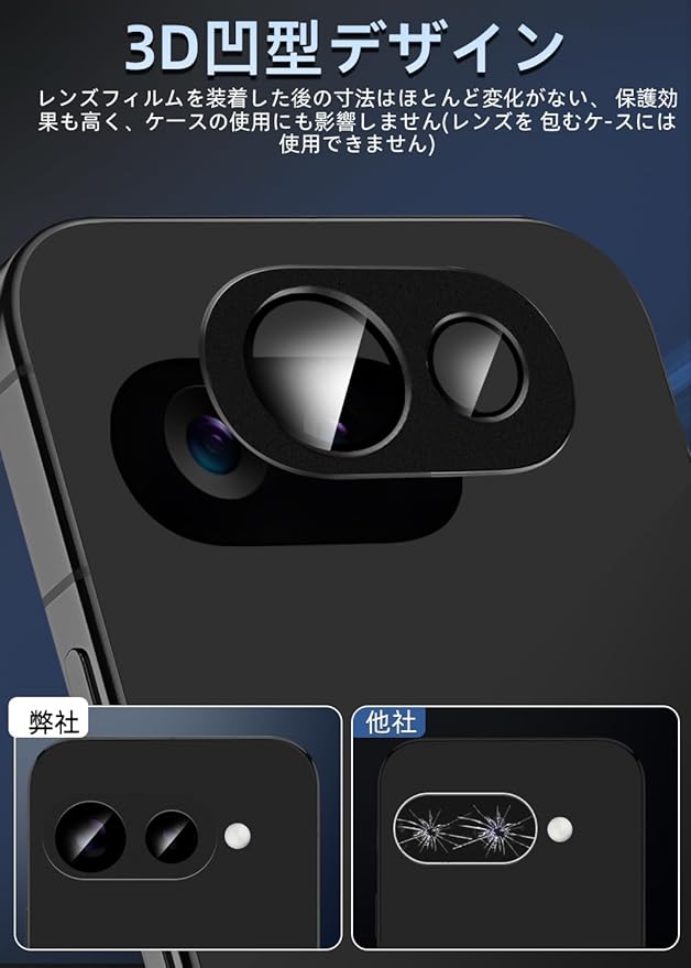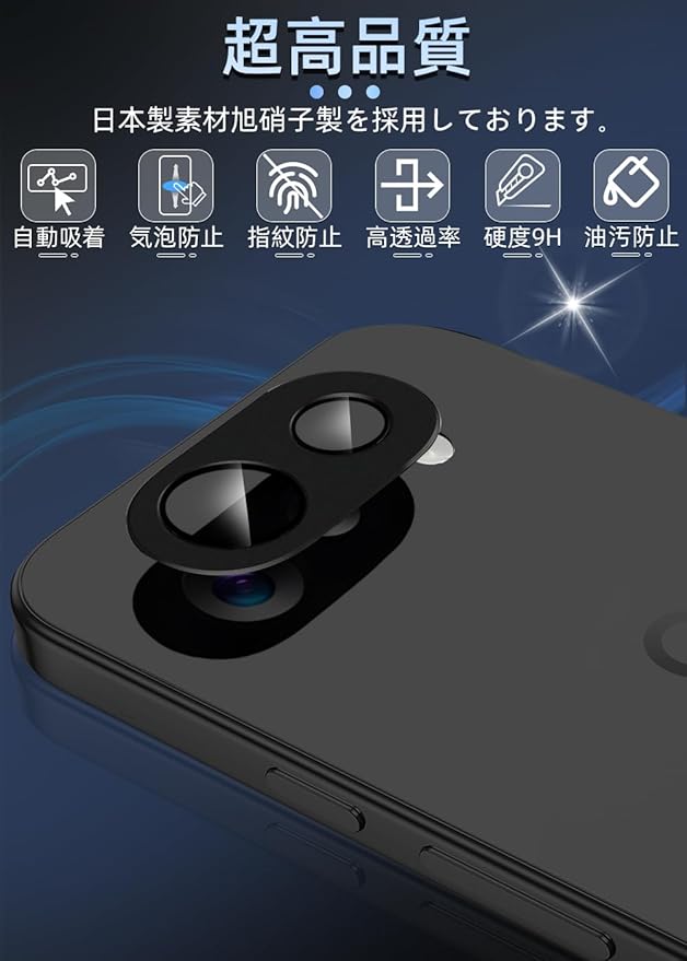 【対応機種・アルミ合金一体感】Google Pixel9a 専用カメラフィルム1枚。Google Pixel9a機種と同じ色で本体のレンズ部分と完全に融合していく、違和感なく、一体感と高級感が溢れています。衝撃に強いアルミ合金製+日本製9H強化ガラスの組み合わせ全面保護タイプで最高な保護力を提供しています。擦り傷や衝撃からカメラレンズをしっかりと守られます。