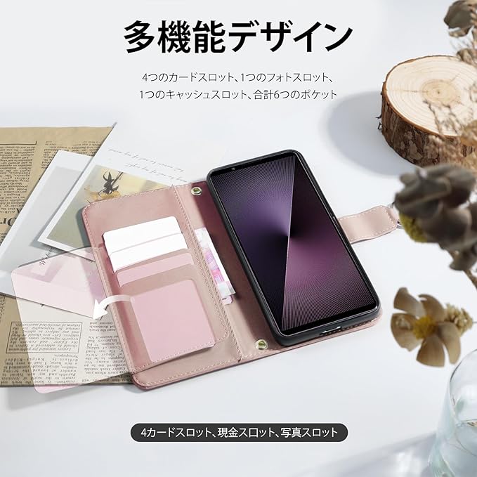 【カード収納機能・スタンド機能】xperia 1 vii ケース 手帳型の内側には6つの独立したポケットがあり、クレジットカード、バスカード、IDカードなどを収納でき、持ち運びが便利で、余分なも
