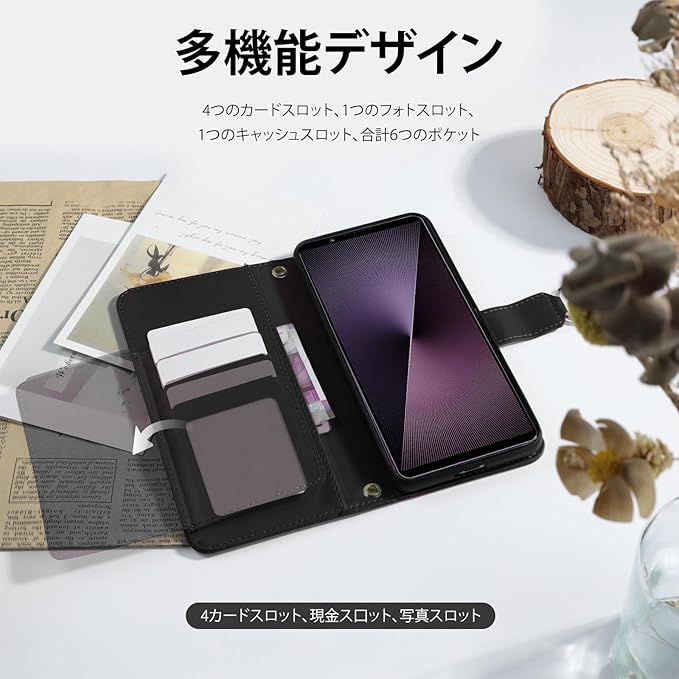 【カード収納機能・スタンド機能】xperia 1 vii ケース 手帳型の内側には6つの独立したポケットがあり、クレジットカード、バスカード、IDカードなどを収納でき、持ち運びが便利で、余分なも