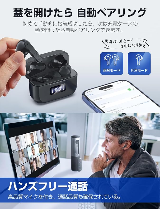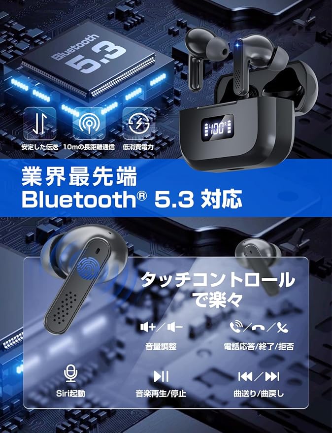 ワイヤレスイヤホン ブルートゥースイヤホン カルナ型 イヤホン Bluetooth イヤホン 小型/軽量 ぶるーとぅーすイヤホン LED数字電量表示 Hi-Fi音質 タッチコントロール 片耳/両耳 快適な装着感 小型軽量 Type‐C急速充電 ハンズフリー通話 マイク内蔵 iPhone/Android適用 ランニング/スポーツ/通勤通学/テレワーク